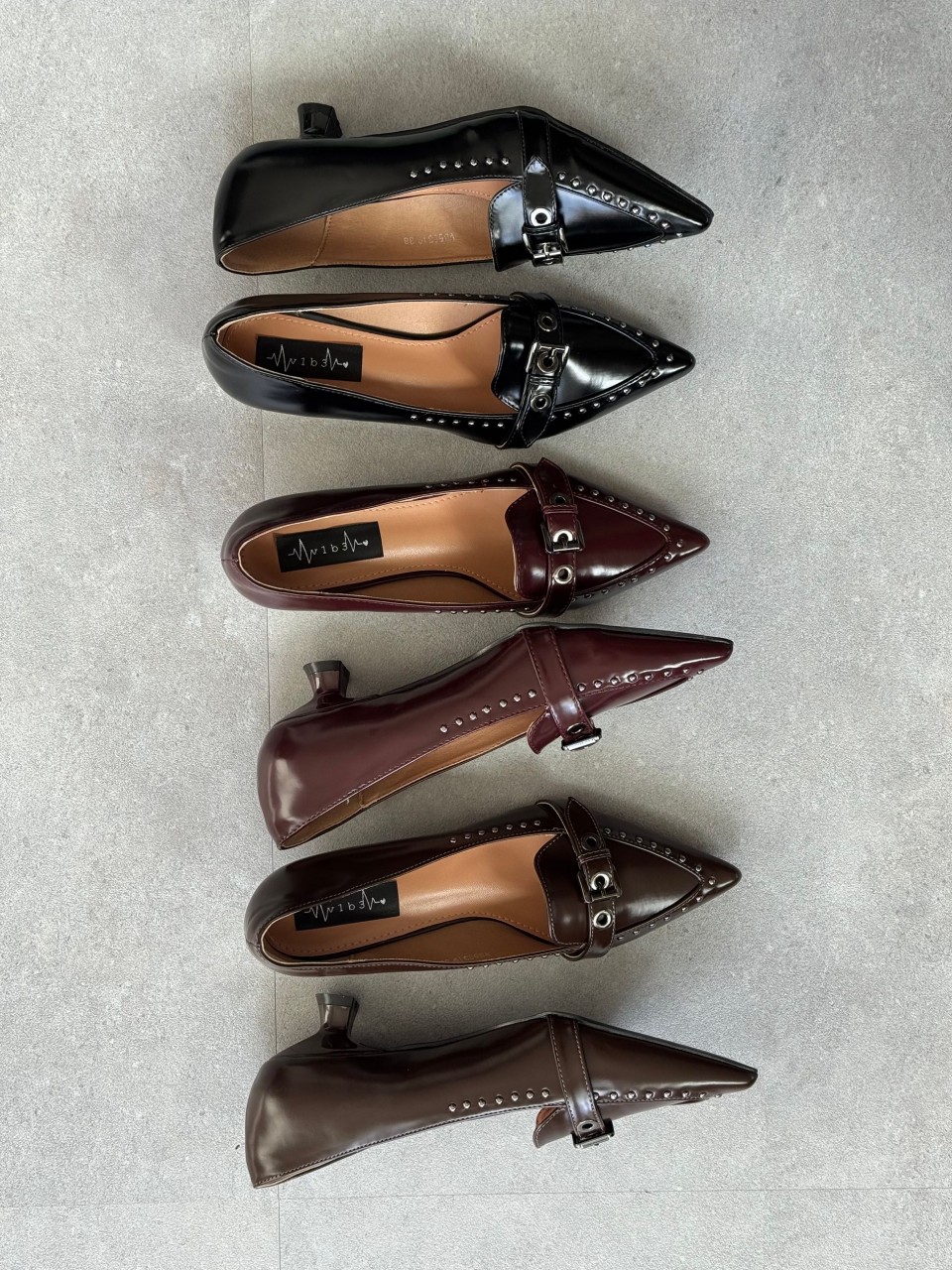 DECOLLETE' IN ECOPELLE CON BORCHIE APPLICATE SU TOMAIA LISTINO CON OCCHIELLI E FIBBIA TACCO CM 2 CALZATA REGOLARE SE SI OSCILLA TRA DUE NUMERI SI...
