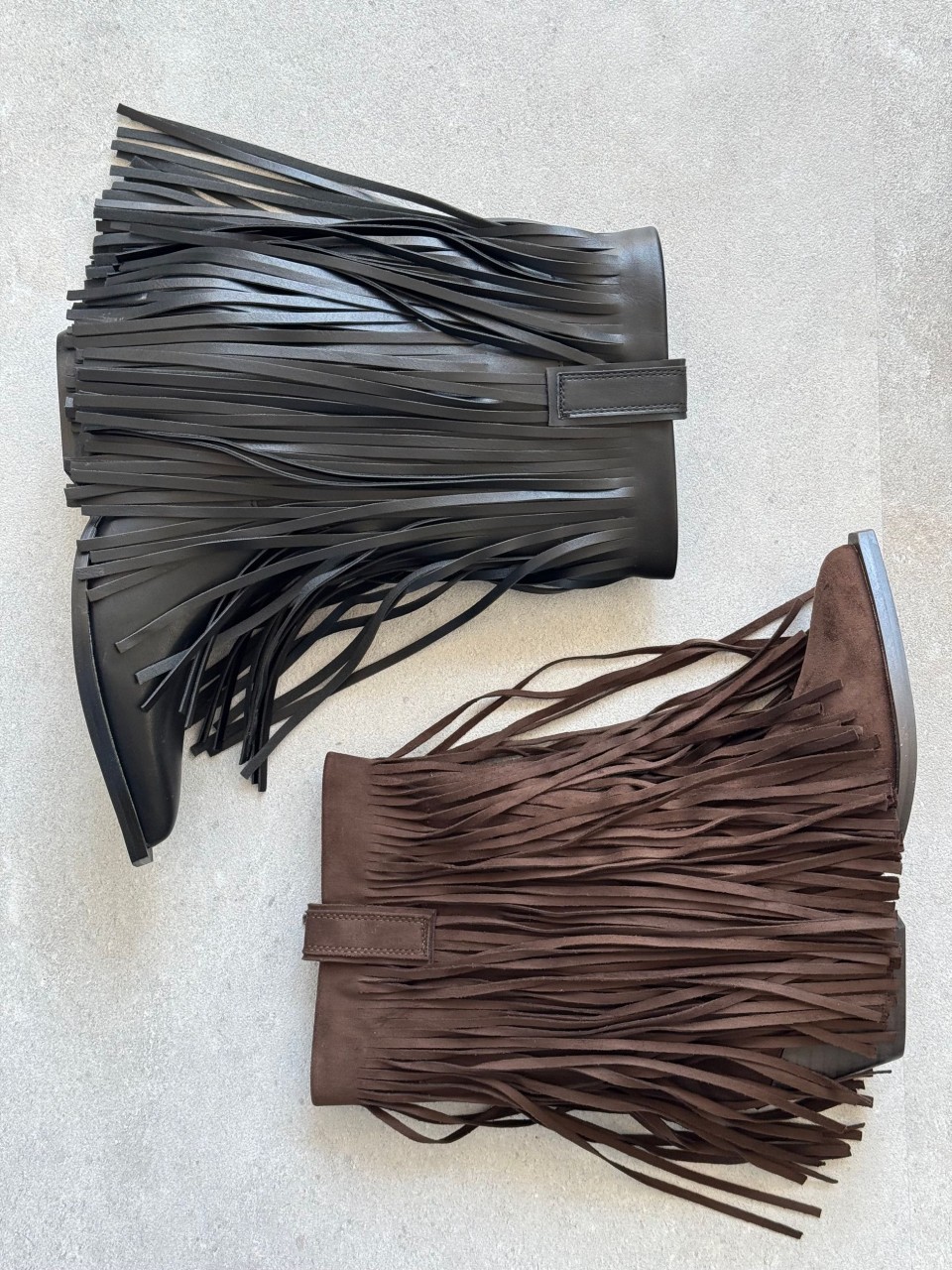 STIVALETTO A PUNTA IN ECOPELLE CON FRANGIA CHE RICOPRE IL GAMBALE CERNIERA INTERNA TACCO 5 CM CALZATA REGOLARE SE SI OSCILLA TRA DUE NUMERI SI...