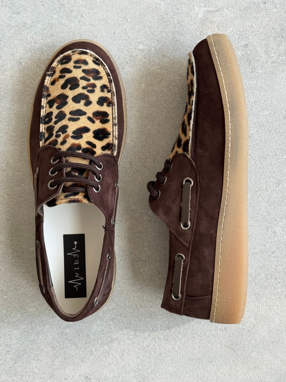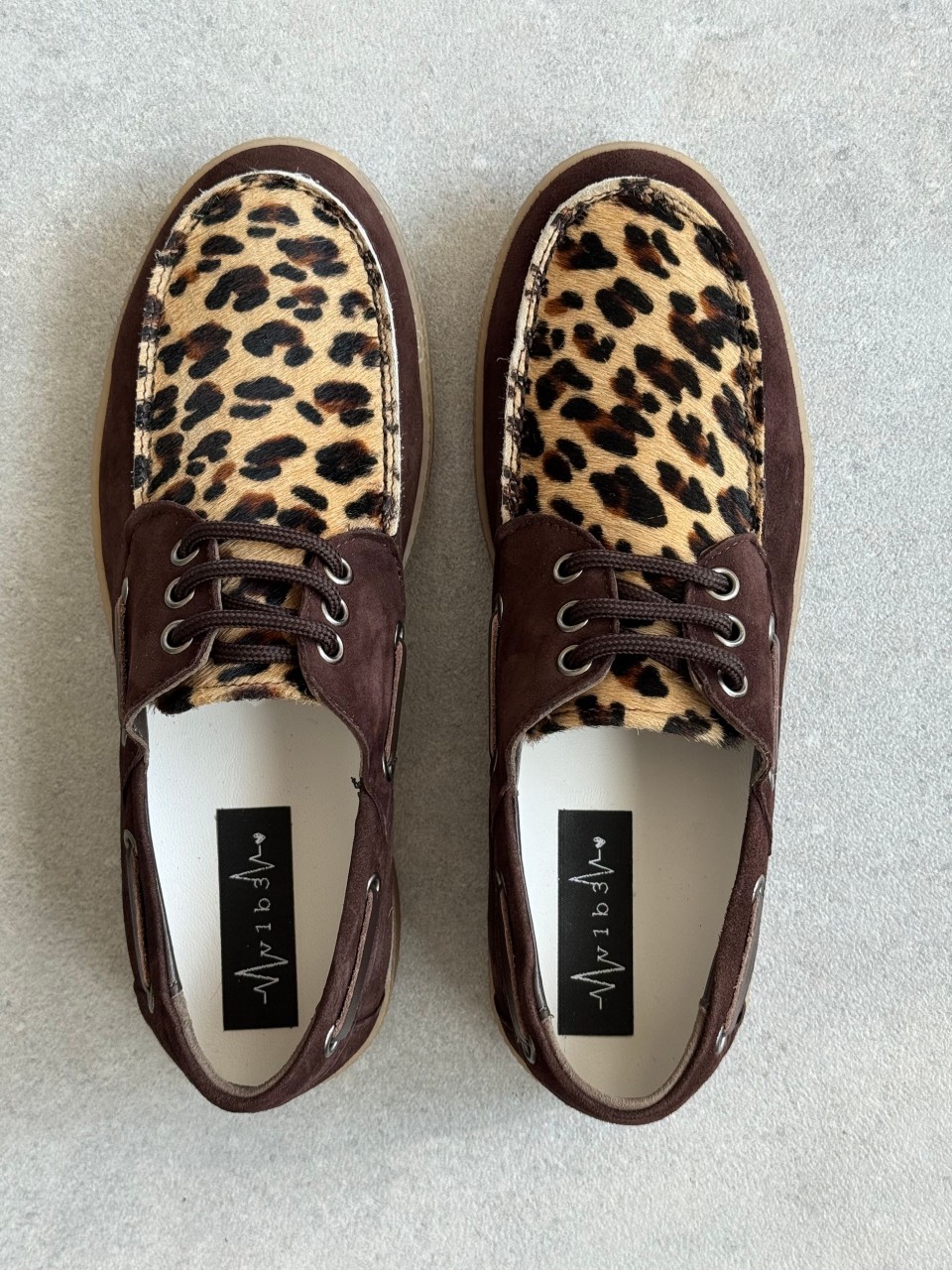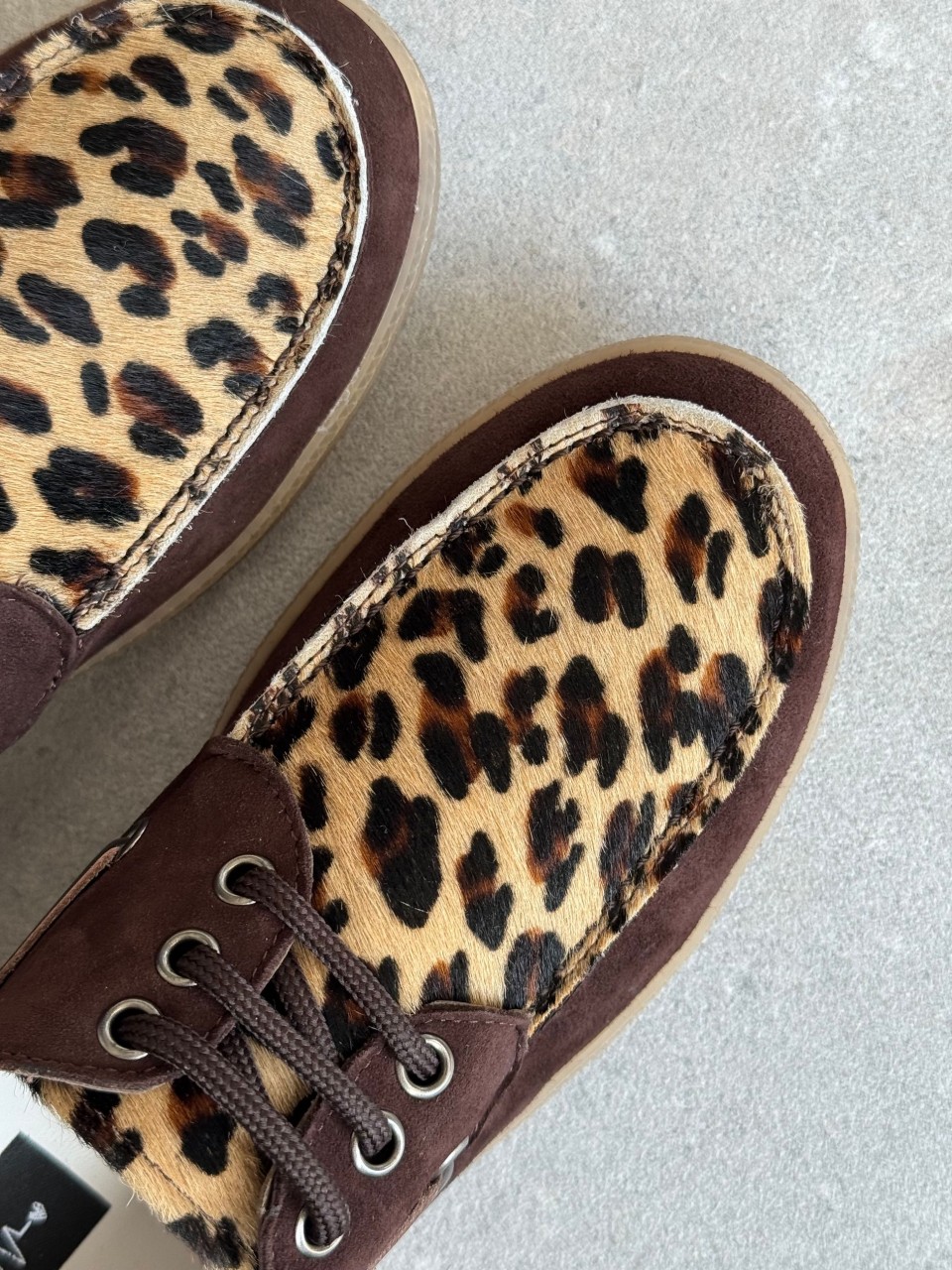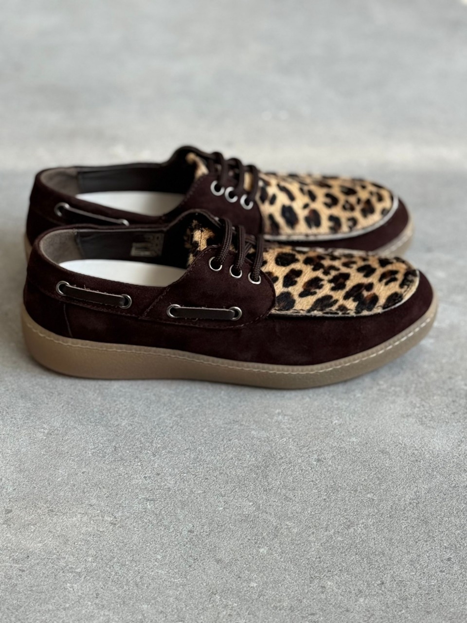 MOCASSINO CON LACCI IN PELLE E PATTA CAVALLINO.